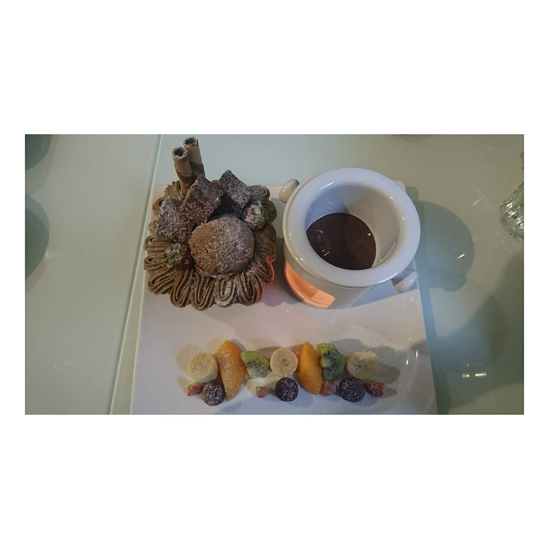 第二張是蜜糖吐司+巧克力鍋,一般的蜜糖吐司都是一塊一塊的。這裡的則是用一個大的當容器再放小的,本身吐司是熱的加冰淇淋吃也可以吐司沾著巧克力鍋吃,配水果吃也可以綜合巧克力的甜。